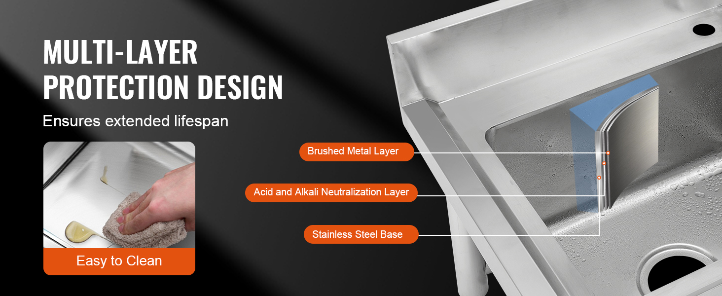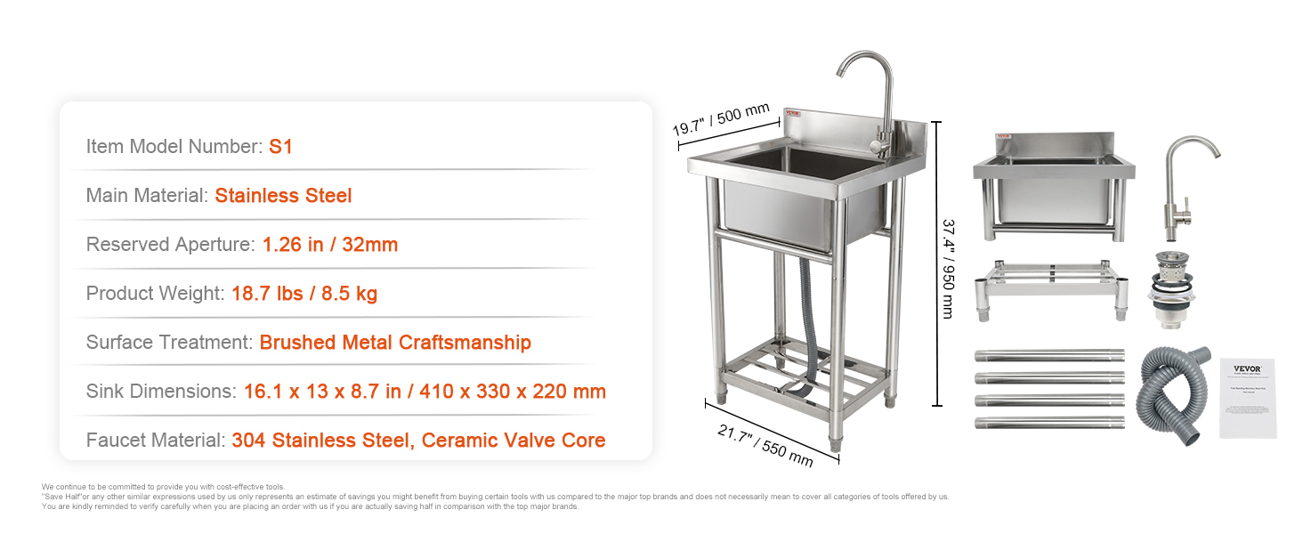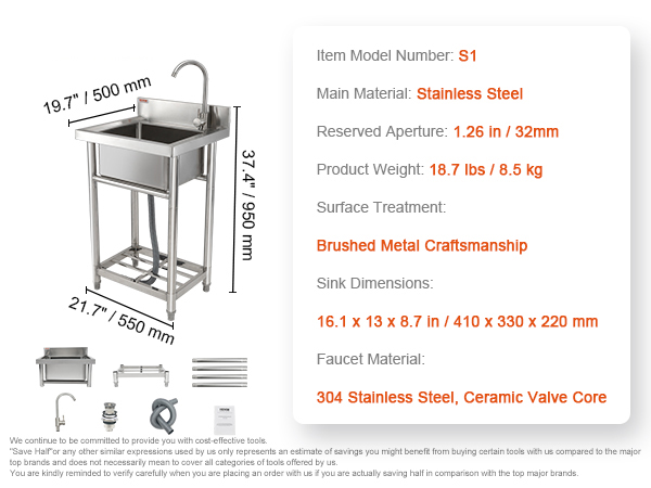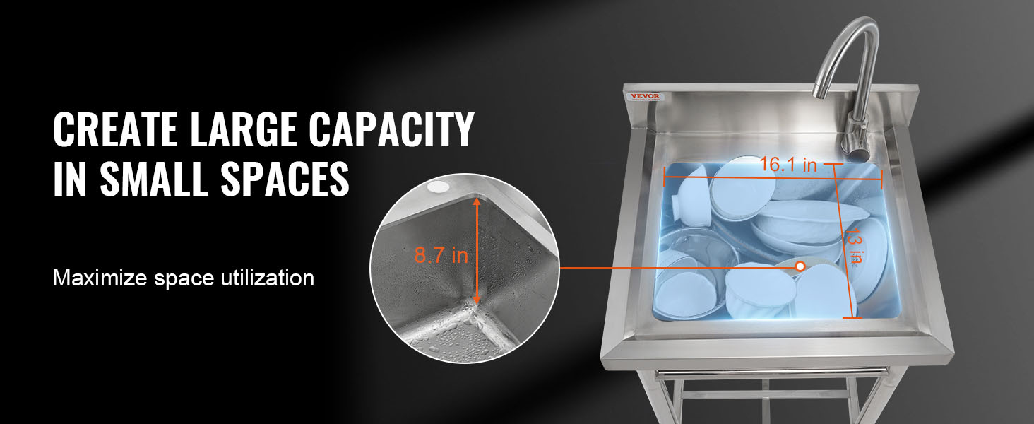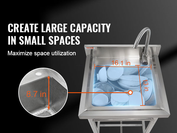 Vapaasti seisova ruostumattomasta teräksestä valmistettu apuallas tarjoaa kompaktissa koossa reilun pesutilan kotiin ja kevyeseen ammattikäyttöön, kuten autotalliin, ravintolaan, keittiöön tai pyykkihuoneeseen. Altaan syvyys on 8.8-tuumainen, joten samassa ulkomitassa on enemmän tilaa pesuun ja huuhteluun.
