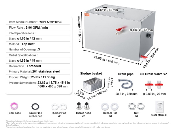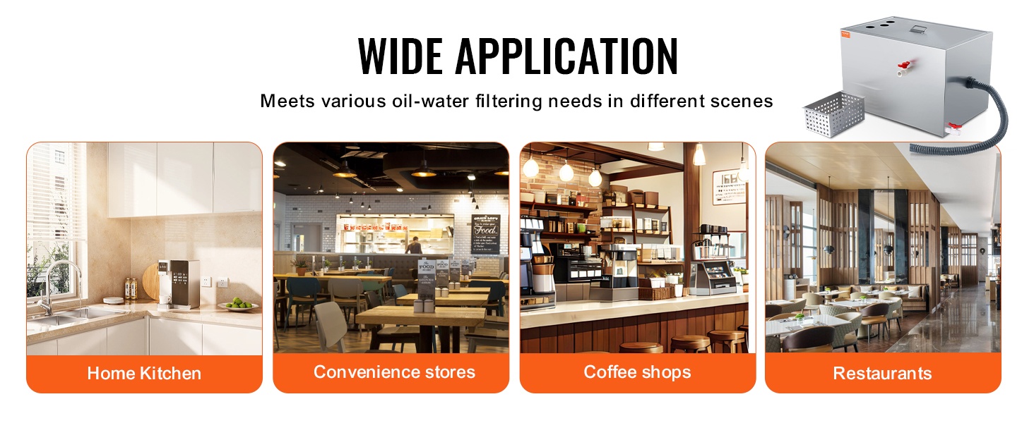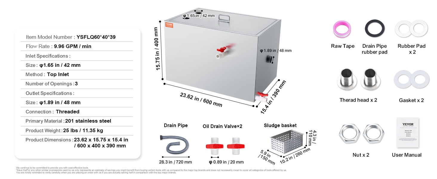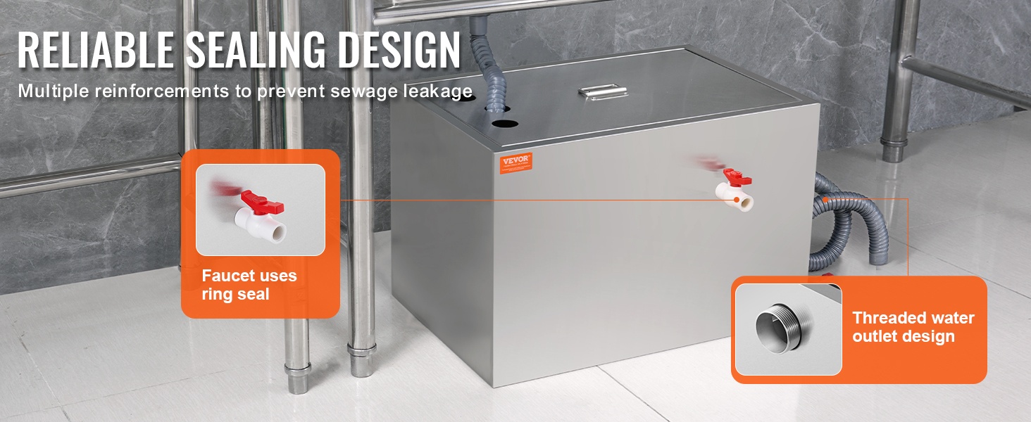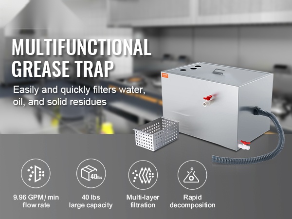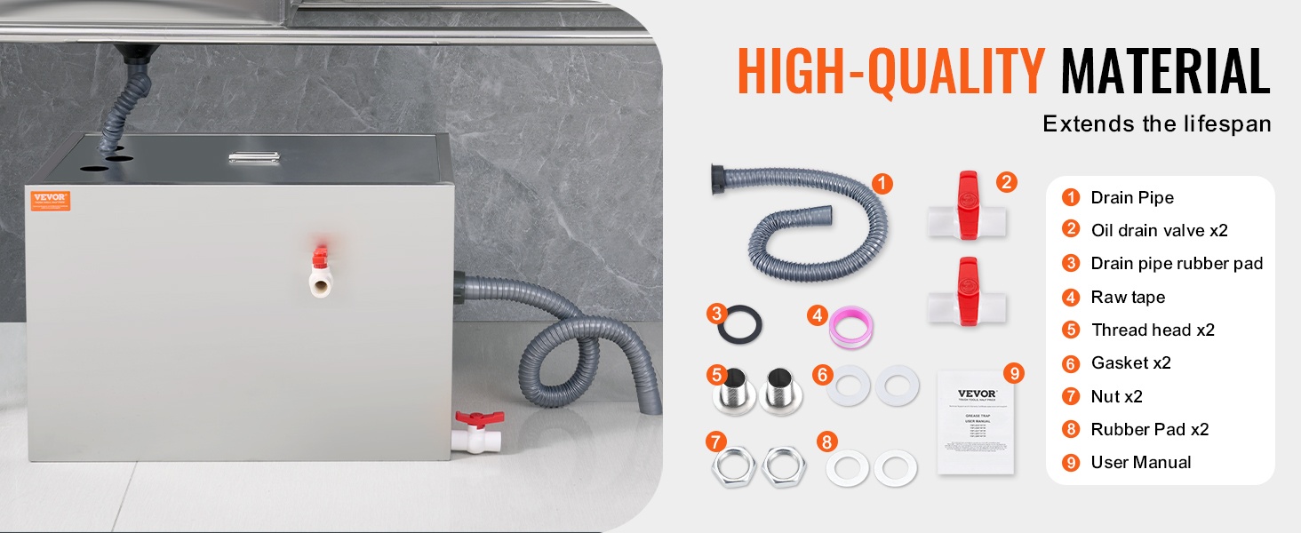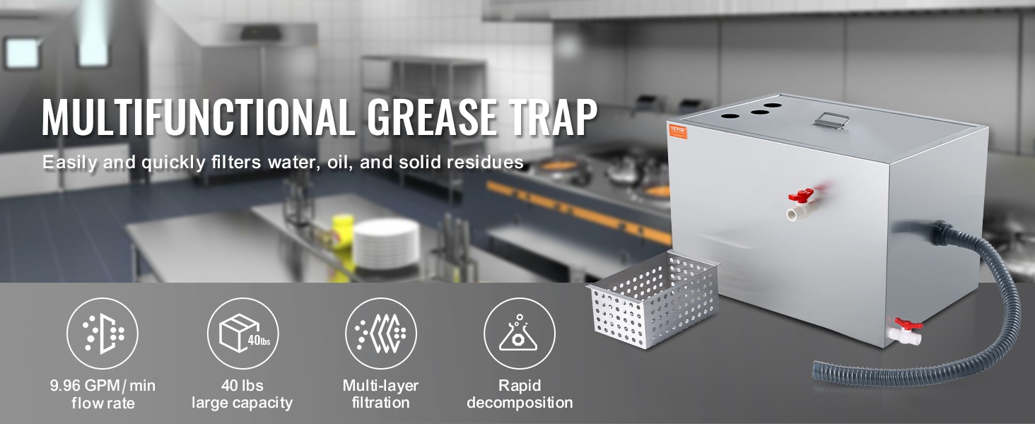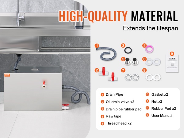 Koko rasvanerotin on valmistettu laadukkaasta 201-ruostumattomasta teräksestä. Rakenne on tukeva, kestävä ja muodonmuutoksia hyvin sietävä. Mukana tulee tarvittava asennussarja, joten laite on helppo ottaa käyttöön altaan alle tai muuhun sopivaan paikkaan.