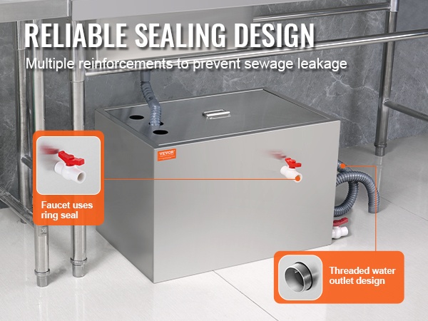 Kannessa on kumitiivisterengas ja molemmilla sivuilla salpalukot, jotka auttavat pitämään kannen tiiviisti paikoillaan. Ulostulossa on kierteinen liitäntä ja hanassa sisäinen tiivisterengas. Useat tiivistysratkaisut yhdessä ehkäisevät jäteveden vuotoja tehokkaasti.