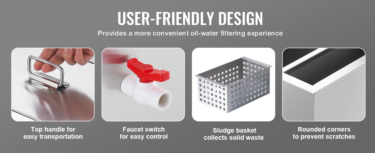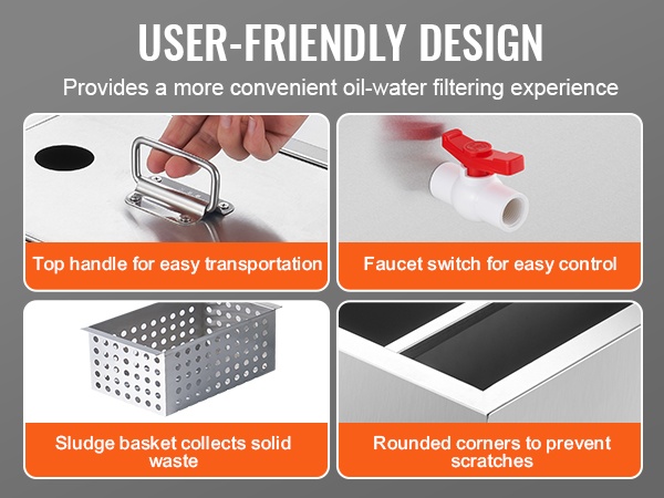 Yläosassa oleva kahva helpottaa laitteen siirtämistä ja käsittelyä. Vesihanan kytkin mahdollistaa ulostulon virtauksen helpon hallinnan. Lietekori kerää kiinteät jätteet ja ruokajäämät ennen viemäriin päätymistä, ja pyöristetyt kulmat parantavat turvallisuutta asennuksen ja puhdistuksen aikana.