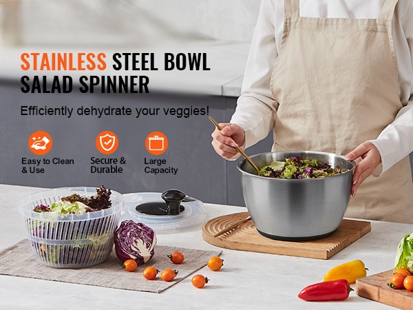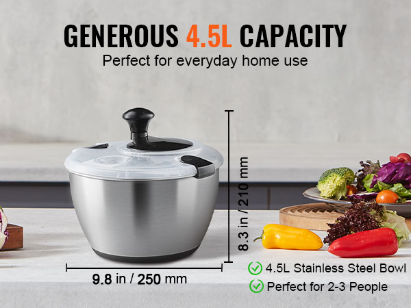 Ruostumattomasta teräksestä valmistettu salaattilinkoja helpottaa vihannesten, yrttien, marjojen ja hedelmien pesua ja kuivausta. Tilava 4.5L kulho ja 3L sisäkori sopivat jokapäiväiseen ruoanlaittoon, kun taas yhdellä kädellä painettava mekanismi tekee linkouksesta vaivatonta.