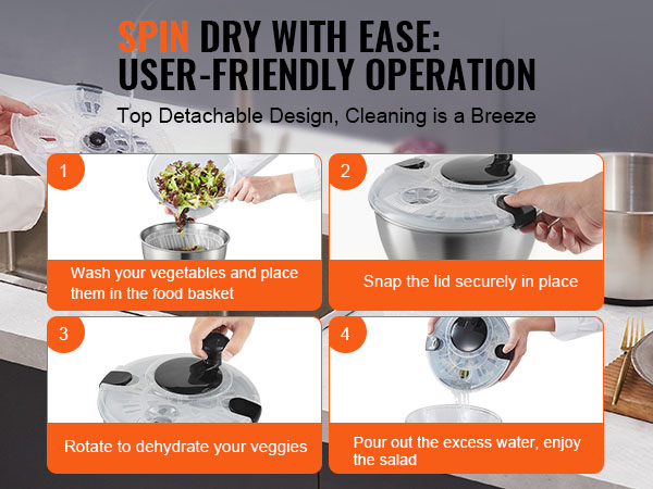 Huuhtele vihannekset tai hedelmät, aseta ne sisäkoriin, sulje kansi ja paina kahvaa muutaman kerran, kunnes sisältö on hyvin kuivunut. Kannen voi irrottaa perusteellista puhdistusta varten, ja se kestää konepesun. Kulhoa voi käyttää myös sekoitus- tai säilytyskulhona.