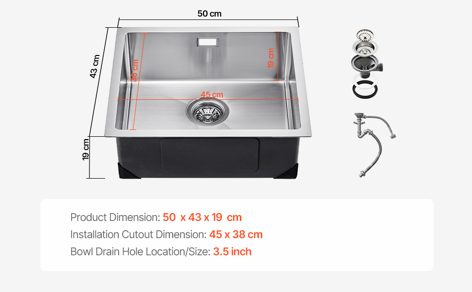 Ulkomitta: 50x43 cm. Sisämitta: 45x38 cm. 19 cm lisäsyvyys sopii suurten keittoastioiden pesuun. Moderni ja selkeä muotoilu kestää hyvin päivittäisessä käytössä. Varmista mittojen yhteensopivuus työtasosi kanssa ennen asennusta.