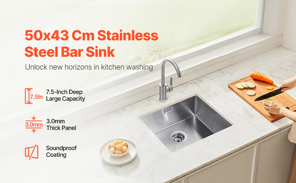 Ruostumattomasta teräksestä valmistettu 50x43 cm allasratkaisu sopii keittiöön, kodinhoitohuoneeseen, baariin tai pieneen valmistelukeittiöön. 19 cm syvä allas helpottaa suurten kattiloiden ja pannujen pesua, ja ajaton muotoilu sopii monenlaisiin tyyleihin.