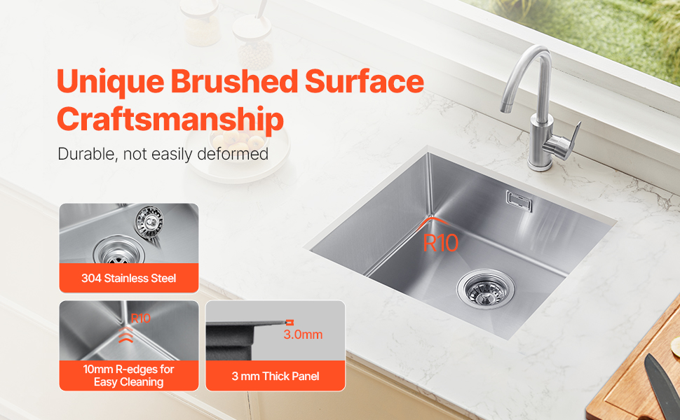 Työtasoallas on valmistettu korkealaatuisesta 304-ruostumattomasta teräksestä. Materiaali kestää naarmuja ja tahroja, ja paksunnettu teräs lisää altaan käyttöikää ja jämäkkyyttä.