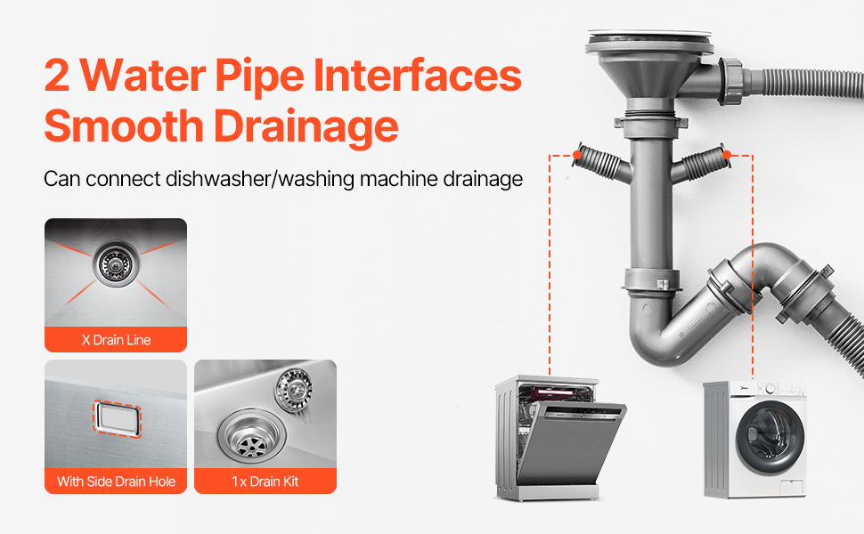 Altaan pohjassa on X-muotoinen kaato, joka ohjaa veden nopeasti kohti viemäriä ja estää veden kertymistä. Mukana tuleva viemärisarja varmistaa sujuvan vedenpoiston. Lisäksi sivuviemärissä on 2 vesiputkiliitäntää, joihin voi kytkeä esimerkiksi astianpesukoneen, mikä helpottaa järjestelmän kokoamista.