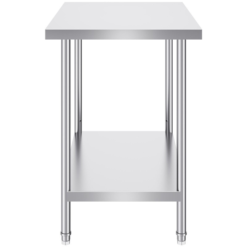 Tämä ruostumattomasta teräksestä valmistettu työtaso sopii hyvin sekä ammattikeittiöihin että kotiin, autotalliin tai pihalle. Kestävä rakenne ja säädettävät hyllytasot tekevät siitä käytännöllisen ratkaisun ruoanvalmistukseen, säilytykseen ja erilaiseen työskentelyyn.