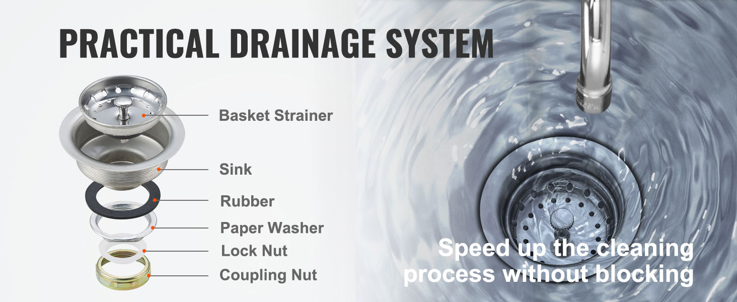 Käytännöllinen viemäröintijärjestelmä ja siivilä takaavat nopean pyörteisen vedenpoiston, mikä helpottaa altaan puhtaana pitämistä ja vähentää tukkeutumisriskiä.