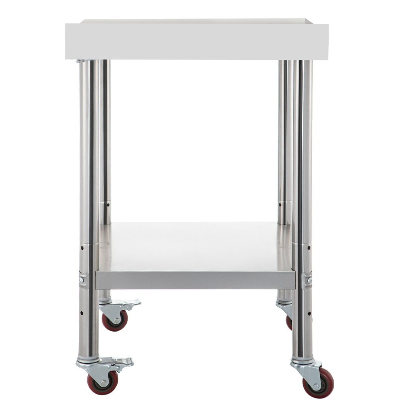 2 inch / 5 cm korkea roiskesuoja auttaa pitämään laitteet ja tarvikkeet pöydällä. Pyöristetyt reunat lisäävät käyttömukavuutta ja turvallisuutta, ja kolmionmuotoiset tukirakenteet parantavat pöydän vakautta. Neljä pyörää, joista kahdessa on jarrut, tekevät pöydästä helposti liikuteltavan.
