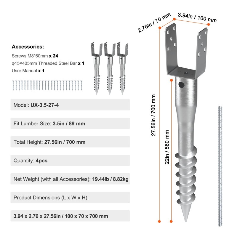 - Pakkaus sisältää: 4 maapiikkiä, 6 kiinnitysruuvia ja raudoitetangon (rebar) asennusta varten