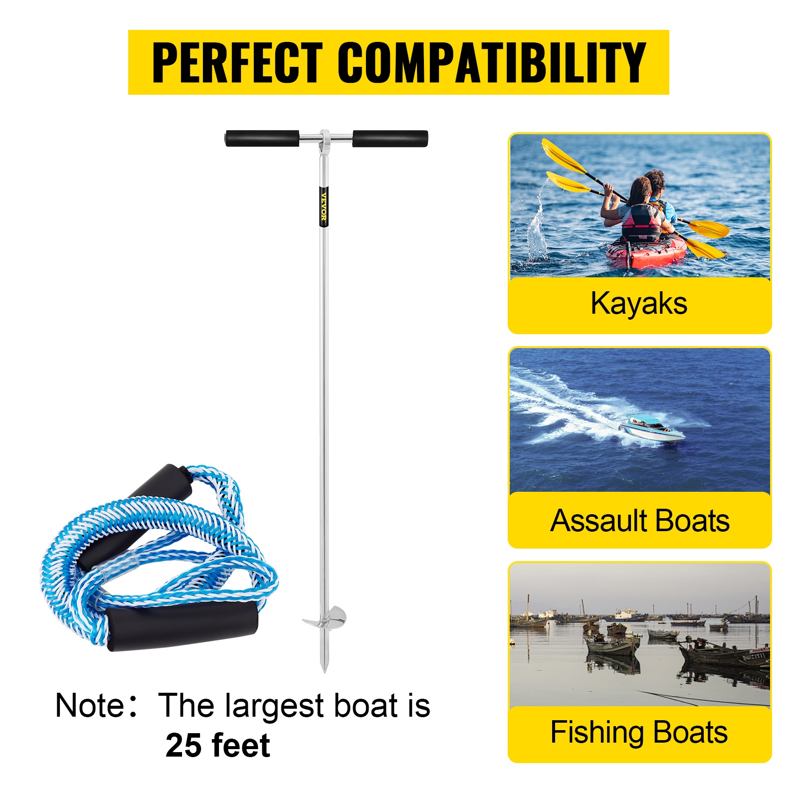 Hiekkanaanteri sopii useille pienille vesikulkuneuvoille, kuten vesijeteille, kajakeille, pienille kalastusveneille ja ponttooniveneille. Suositeltu suurin pituus on 25 jalkaa – tarkista oman veneesi koko ennen hankintaa.