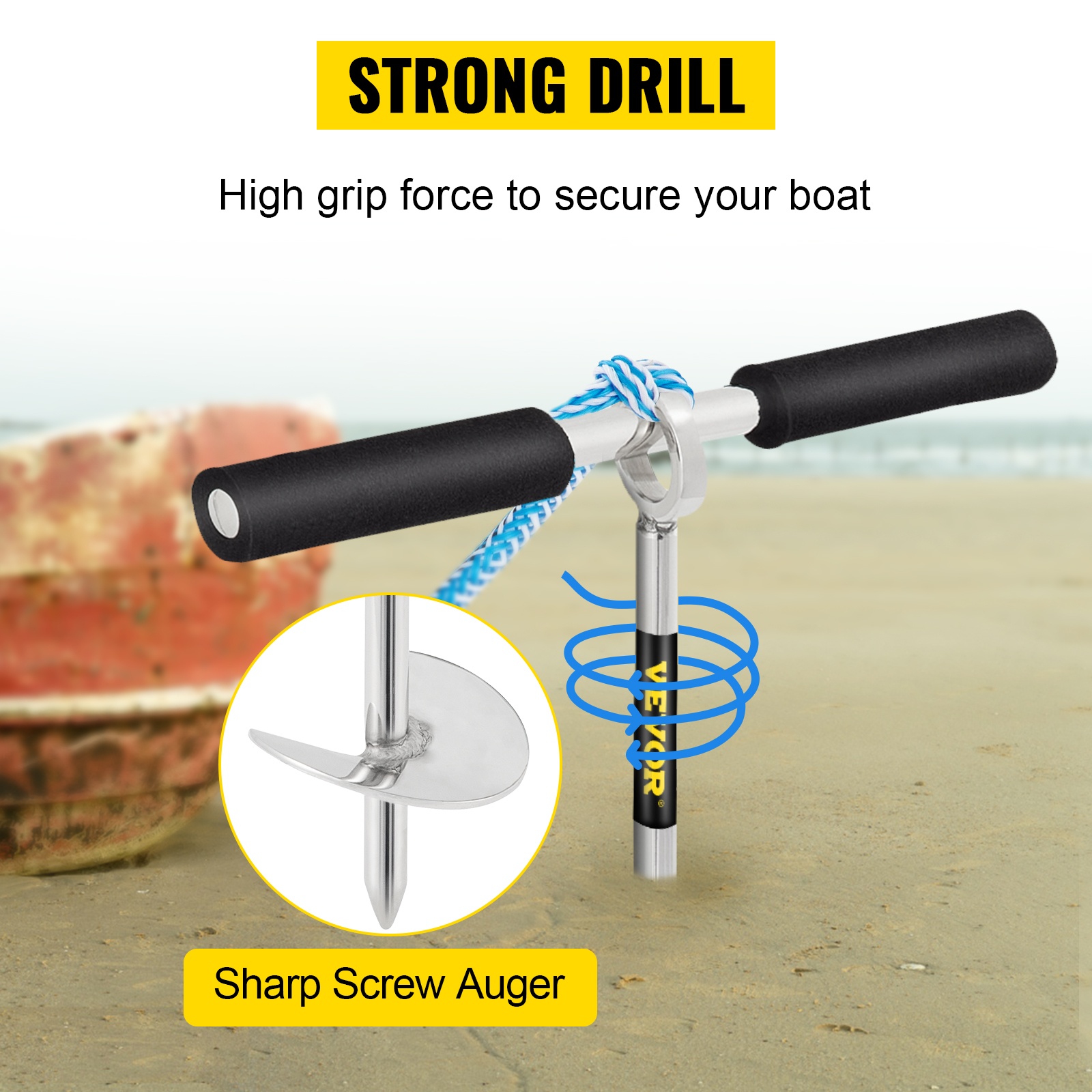 Terävä kierreterä ruuvautuu helposti hiekkaan. Suuri kitka pitää veneen tai vesijetin paikoillaan myös aallokossa ja ohitusaaltojen aikana.