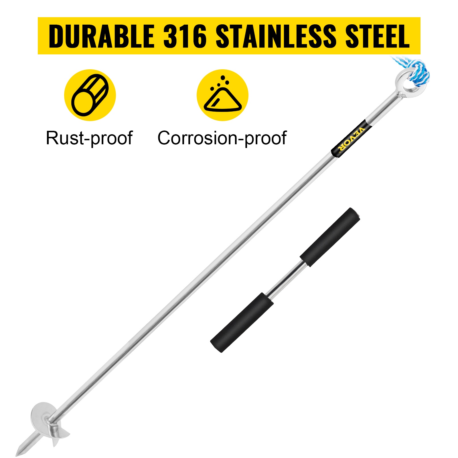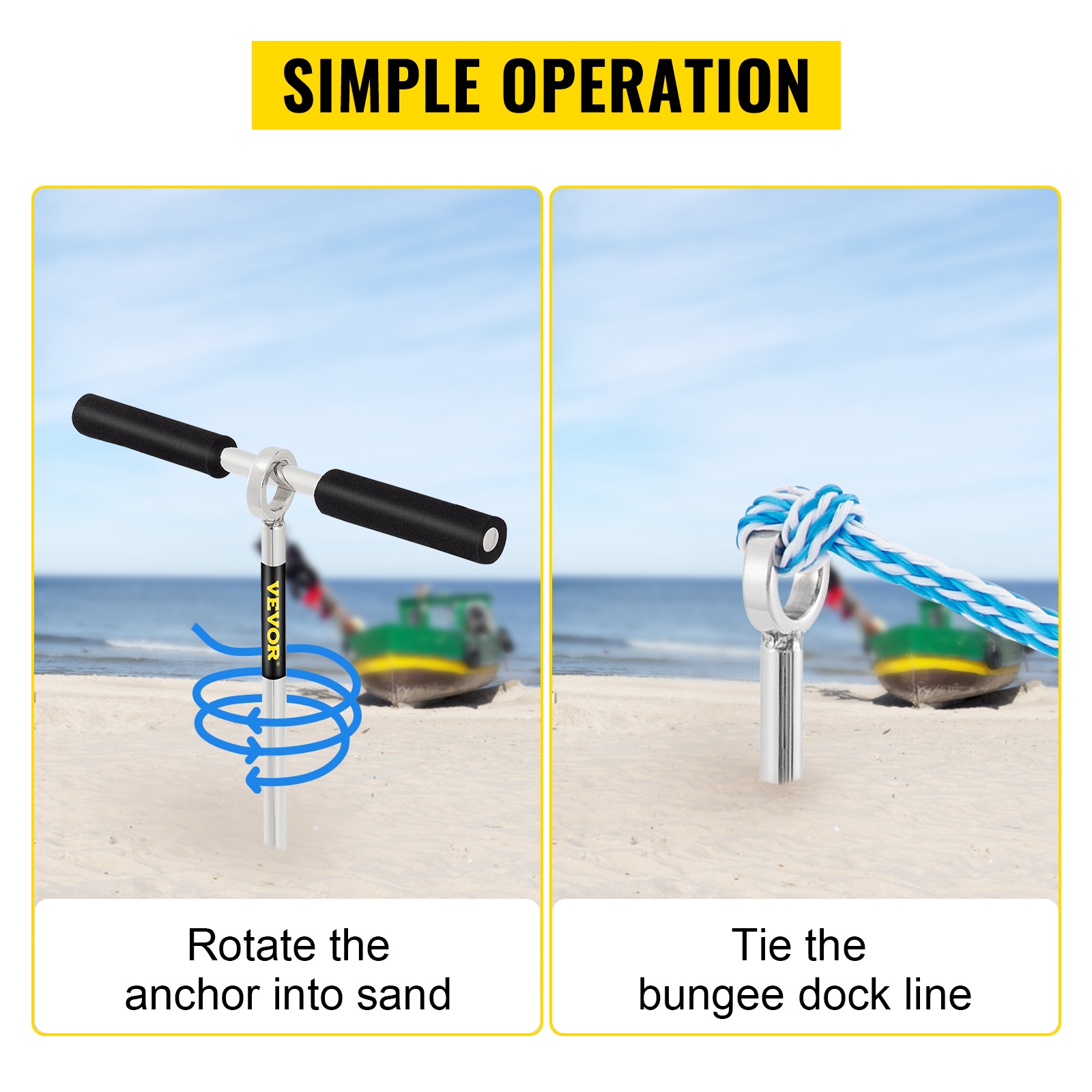 - Helppo käyttö – pyöritä ankkuri hiekkaan ja kiinnitä joustava kiinnitysköysi.