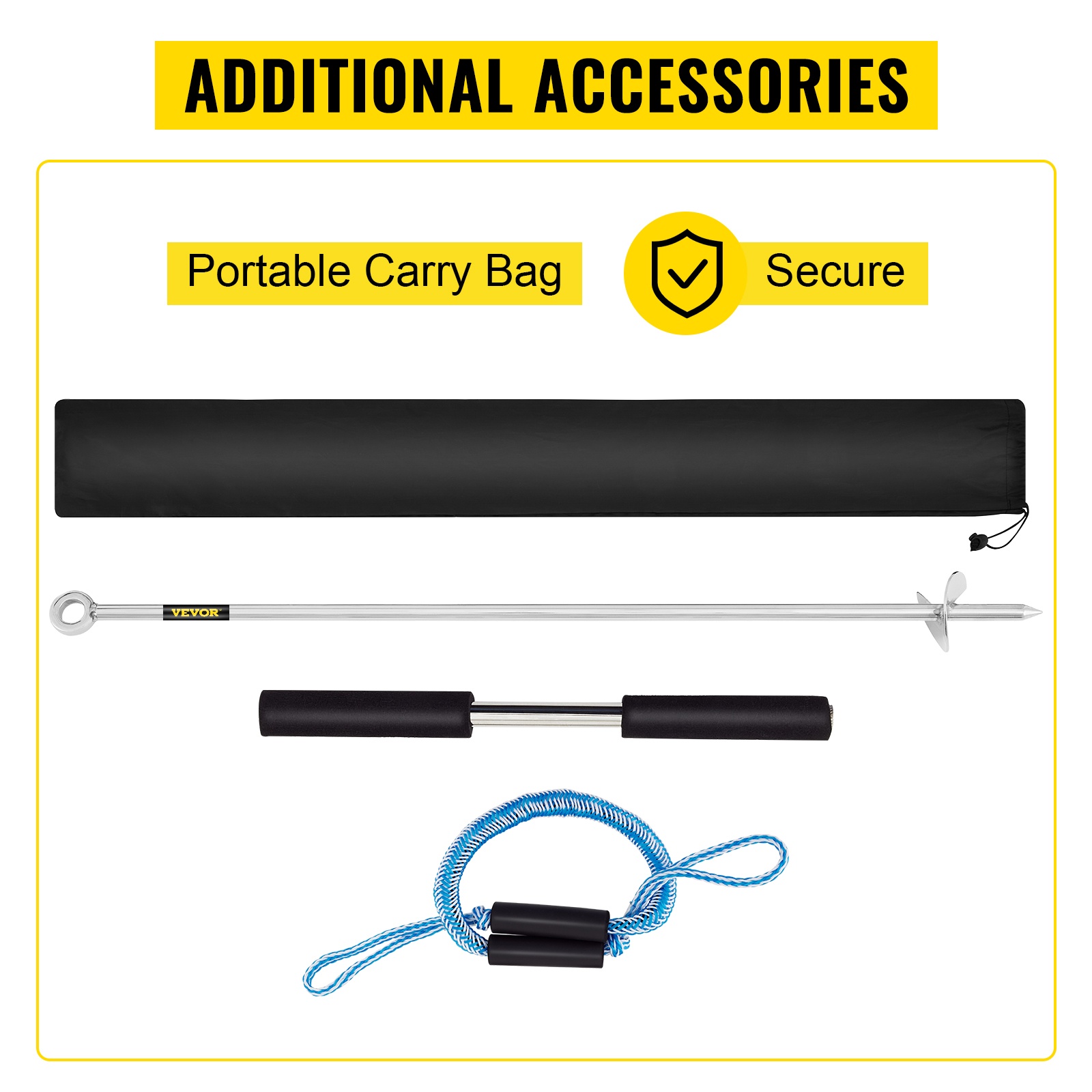 - Mukana joustava kiinnitysköysi ja kantolaukku helppoon kuljetukseen.