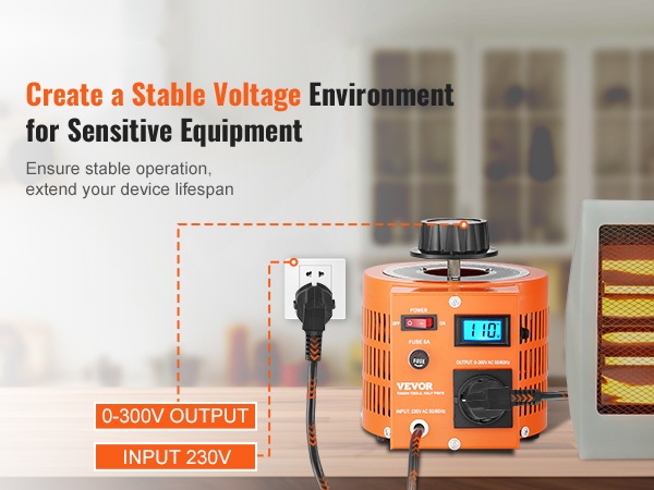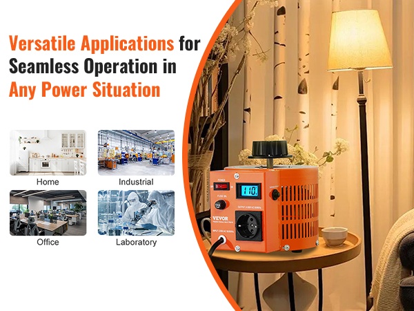 Muuntaja soveltuu erilaisiin käyttökohteisiin, kuten työpajalle, laboratorioon, toimistoon tai kotiin, kun halutaan säätää ja vakauttaa vaihtojännitettä laitteiden vaatimusten mukaan.