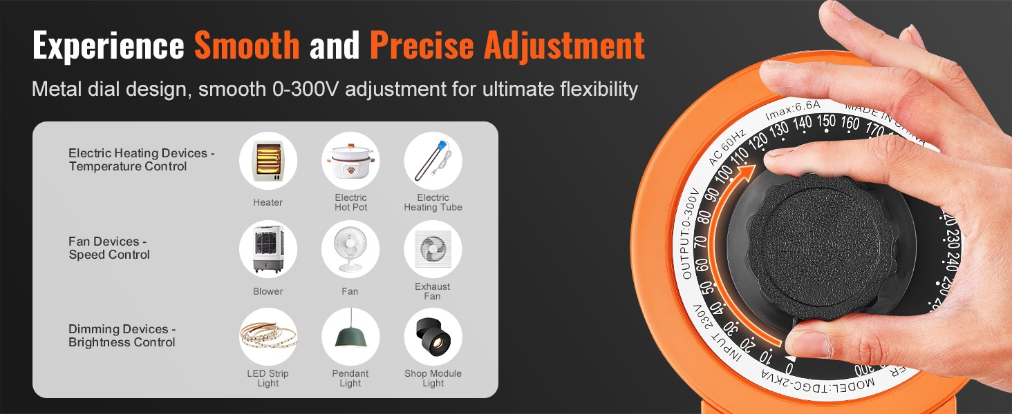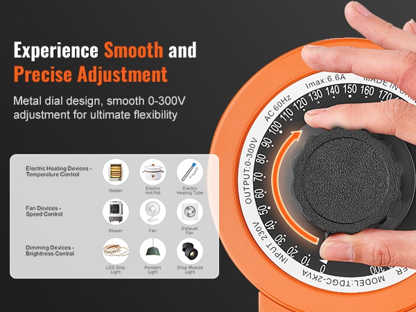 Muuntajassa on päällä sijaitseva säätönuppi, jonka avulla jännitettä voi säätää tarkasti välillä 0–300V. Näin voidaan mukauttaa syöttöjännite eri laitteiden tarpeisiin. Sisäänrakennetut kuparikäämit auttavat pitämään jännitteen vakaana ja vähentävät sähköhäiriöitä, mikä tukee laitteiden luotettavaa toimintaa.