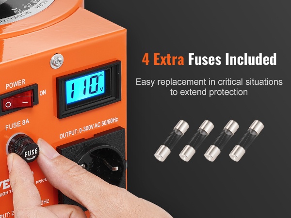 Mukana toimitetaan 4 varasulaketta, joten mahdollinen sulakkeen vaihtaminen käy nopeasti ja laitteet pysyvät paremmin suojattuina. Lämpötilansäädin ja ylikuormitussuoja lisäävät käyttöturvallisuutta erityisesti pitkäaikaisessa käytössä.