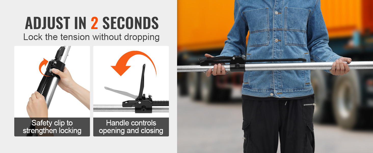 Pituuden säätäminen ja tangon asennus on nopeaa ja helppoa – se vie vain noin 2 sekuntia. Porauksia tai lisätyökaluja ei tarvita. Räikkätanko lukitaan tukevasti turvakiinnikkeellä, ja ulkoinen räikkäkahva vahvistaa kahden teräsputken liitosta, jolloin rakenne pysyy tukevana eikä pääse heilumaan.