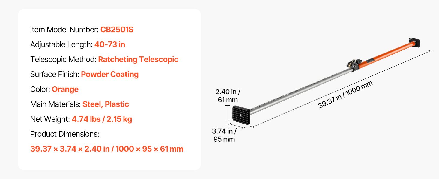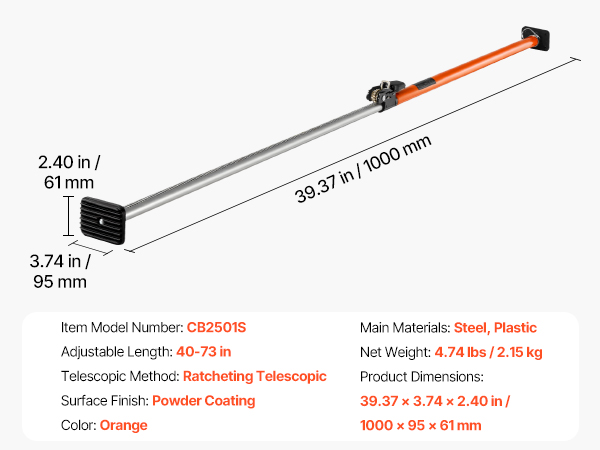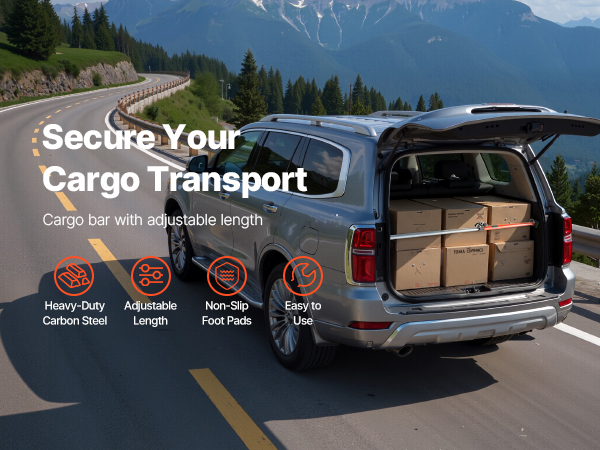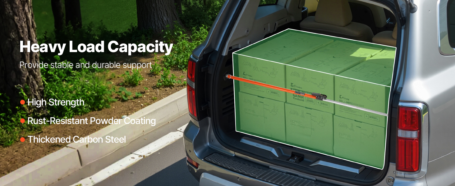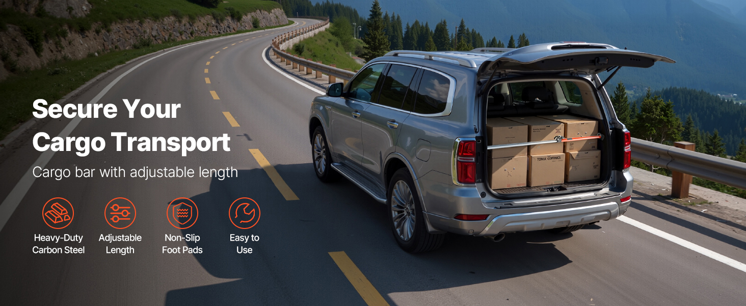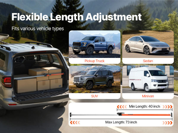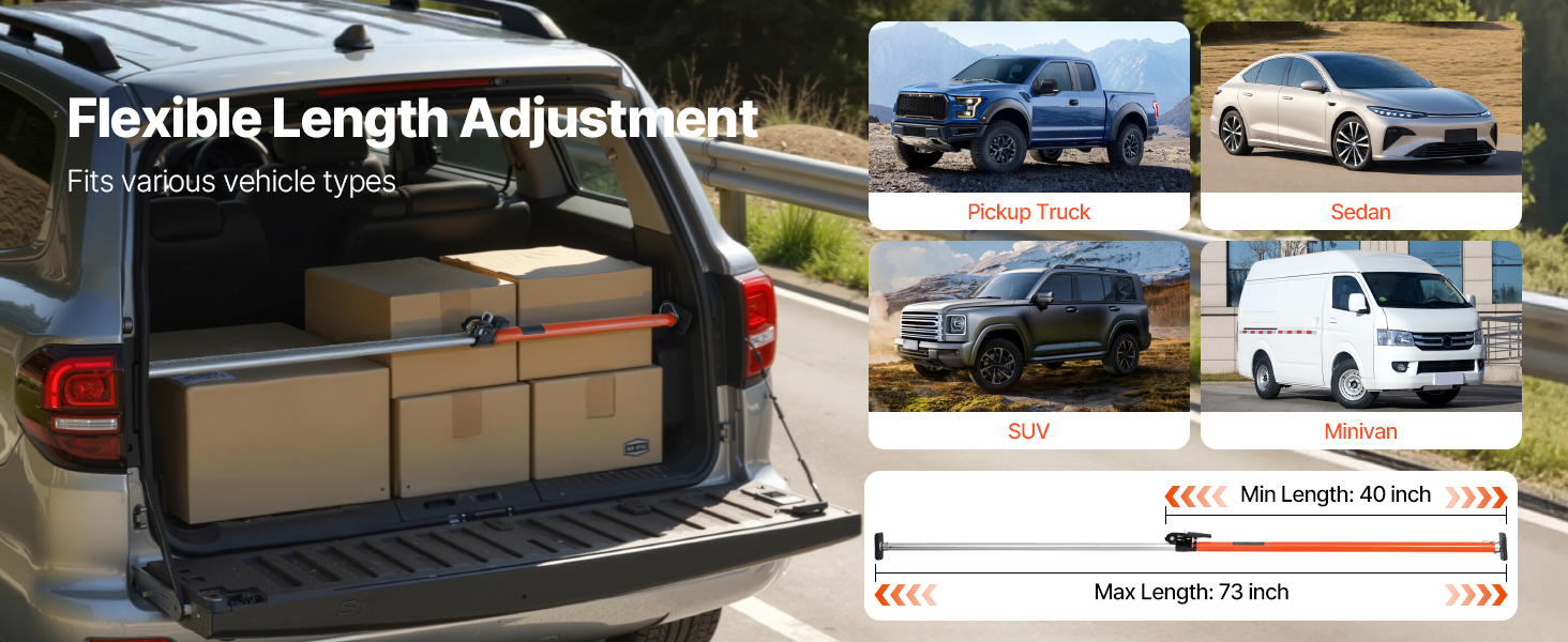 Säädettävä teleskooppipituus 40–73 tuumaa tekee tangosta monikäyttöisen. Se sopii sekä sedaneihin että SUV-autoihin ja auttaa pitämään kuorman vakaana erilaisissa tavaratiloissa.