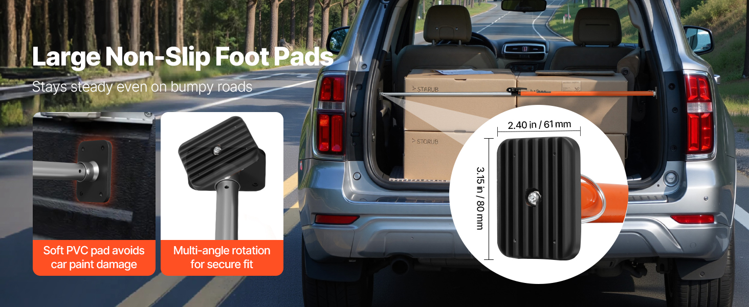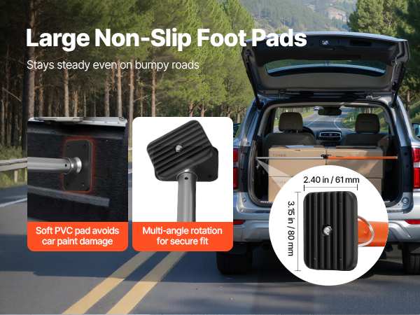 Suurennetut, liukumattomat jalkatyynyt tarjoavat tukevan pidon myös epätasaisilla teillä. Pehmeät PVC-pinnat suojaavat auton maalia ja estävät tankoa liukumasta, jolloin kuorma pysyy vakaana.