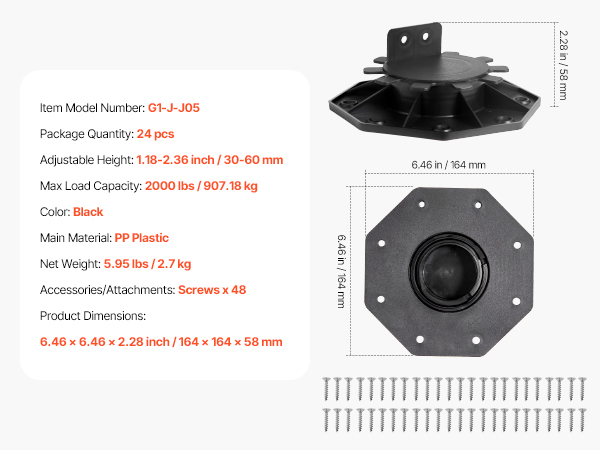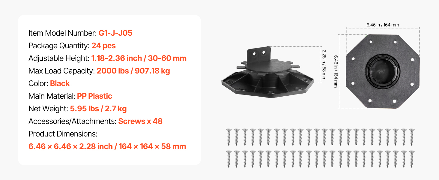 Säädettävä terassijalkatuki 30–60 mm, kantavuus 907 kg, PP-muovi, 24 kpl