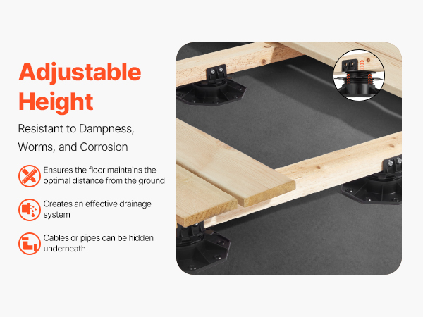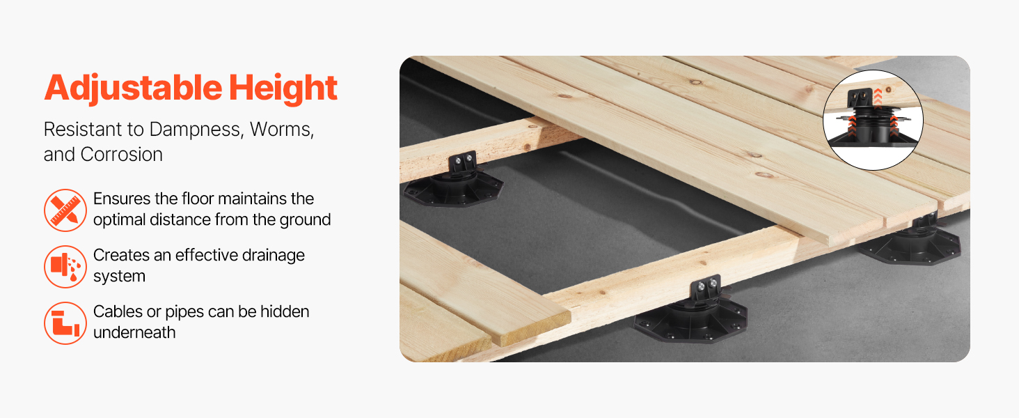 Säädettävä terassijalkatuki pitää rakenteen ihanteellisella etäisyydellä maasta, eristäen kosteuden ja muodostaen toimivan vedenpoiston. Näin se auttaa ehkäisemään puun kosteusvaurioita ja korroosiota sekä mahdollistaa kaapeleiden ja putkien siistin piilottamisen rakenteen alle.