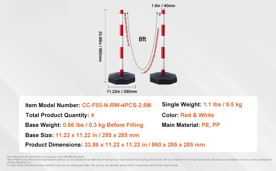Säädettävät liikenteen ohjaustolpat ketjulla 4 kpl, täytettävä pohja, ketju 2,44 m, punainen ja valkoinen, PE/PP