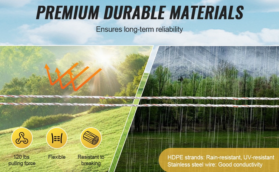 Tämä hyvin näkyvä aitalanka on valmistettu HDPE-säikeistä ja 6 ruostumattomasta terässäikeestä. Rakenne kestää sadetta ja UV-säteilyä, ja langan joustavuus sekä suuri murtolujuus tekevät siitä pitkäikäisen ja kulutusta kestävän, mikä vähentää vaihtojen ja huollon tarvetta.