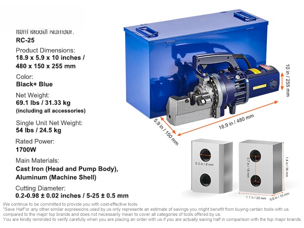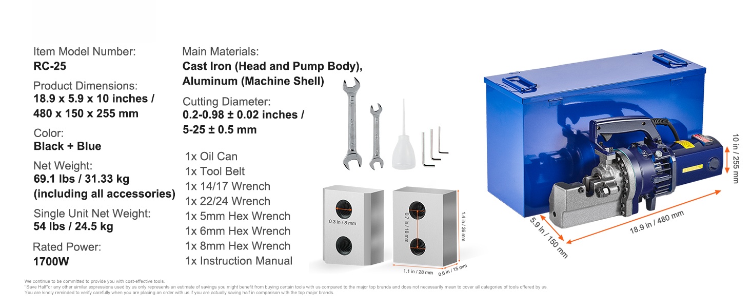 Sähköhydraulinen raudoitusleikkuri 1700W 5–25 mm teräsraudoitukselle RC-25, musta/sininen