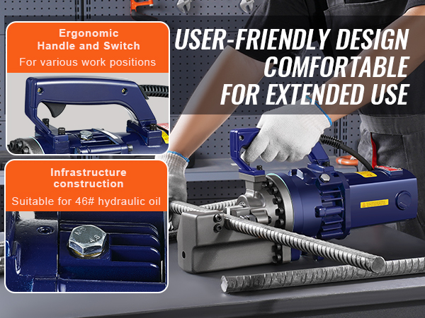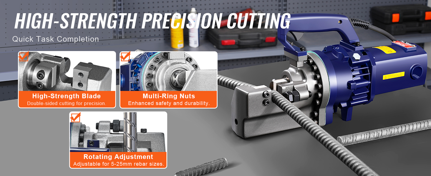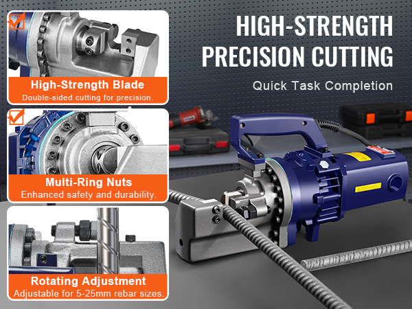 Korkealaatuiset terät on suunniteltu katkaisemaan tangoista molemmilta puolilta. Monirenkainen mutteri lisää käyttöturvallisuutta ja mahdollistaa mutterin kääntämisen katkaisukohtaan, jotta eri paksuiset raudoitustangot saadaan tuettua oikein.