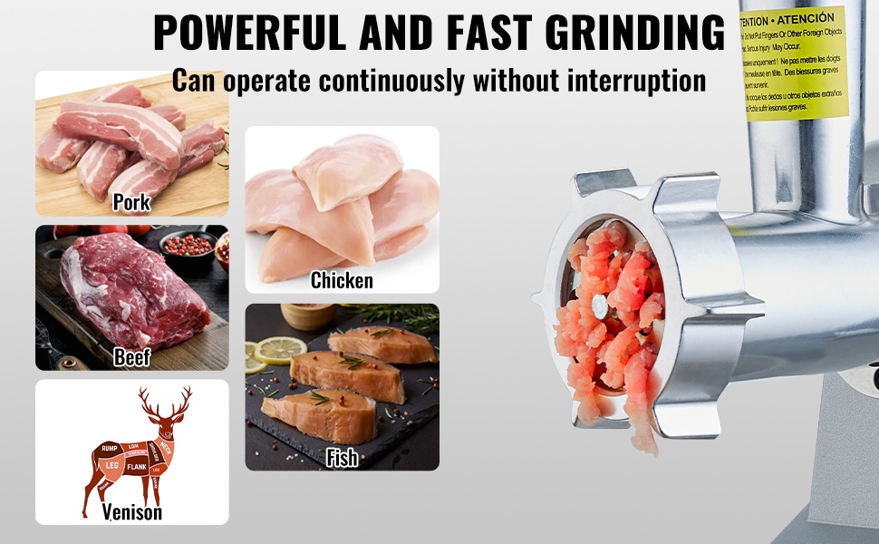 Laitteen huipputeho on 800W ja nimellisteho 575W. Lihamylly pystyy jauhamaan jopa 5 lbs / 2.27 kg lihaa minuutissa ja toimimaan yhtäjaksoisesti yli 30 minuuttia, joten se sopii sekä arkeen että suurempien erien valmistukseen.