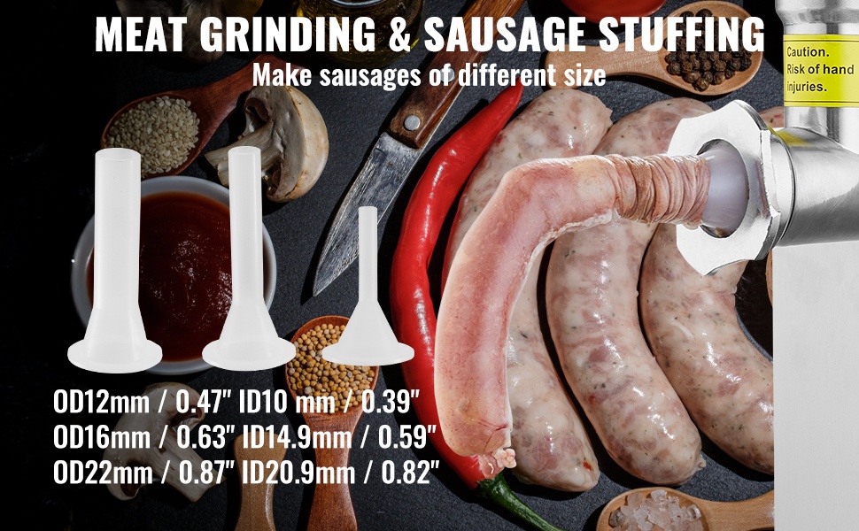 - Mukana terä, 2 jauhatuslevyä, makkaralevy ja 3 täyttöputkea