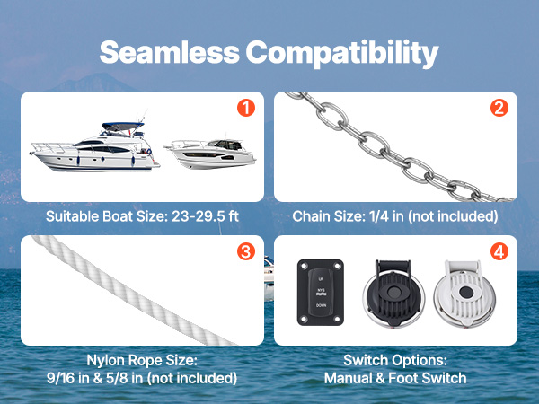 Ankkurivinssi sopii 7–9 m veneisiin ja toimii 6.35 mm ankkuriketjujen sekä 14.3–15.9 mm nailonköysien kanssa. Järjestelmä tukee sekä käsi- että jalkakytkimiä, mikä antaa joustavat ohjausmahdollisuudet.