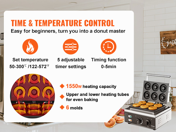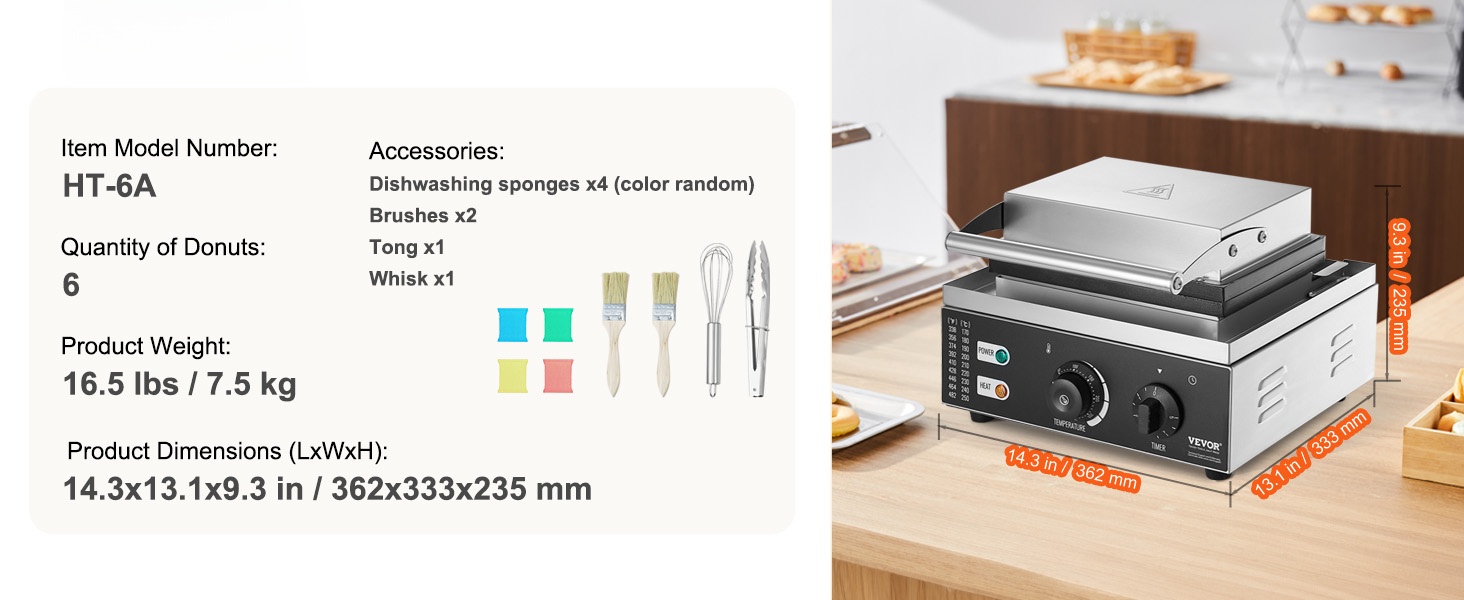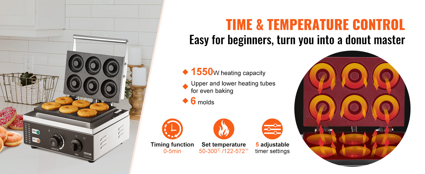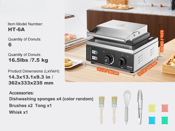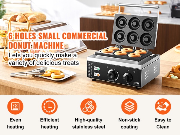 Tämä sähkökäyttöinen donitsikone sopii sekä ammattikeittiöihin että kotikäyttöön. Koneella paistat kerralla 6 donitsia, ja säädettävä lämpötila-alue 50–300℃ antaa hyvän hallinnan erilaisille taikinoille ja paistoasteille.