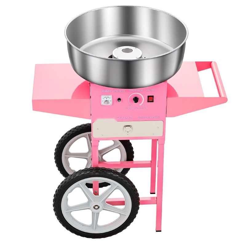 Sähköinen hattarakone kärryllä kotikäyttöön ja kevyeseen ammattikäyttöön. Tehokas 1000W lämmityselementti, suuri 52cm ruostumattomasta teräksestä valmistettu kulho sekä käytännöllinen säilytyslaatikko sokerille ja tarvikkeille. Soveltuu lasten syntymäpäiville, perhejuhliin ja muihin tilaisuuksiin.