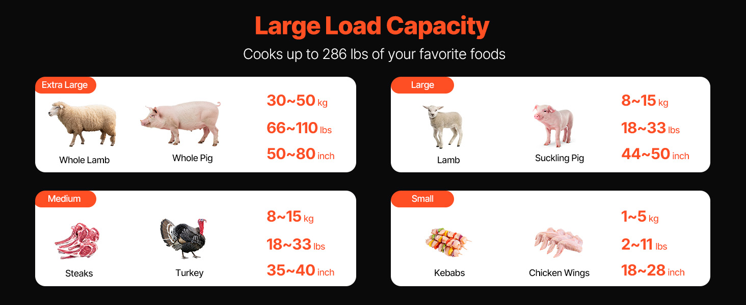 - Kokonaiskantavuus: 130 kg – sopii kokonaisille sioille, lampaille, vuohille ja isoille paistipaloille