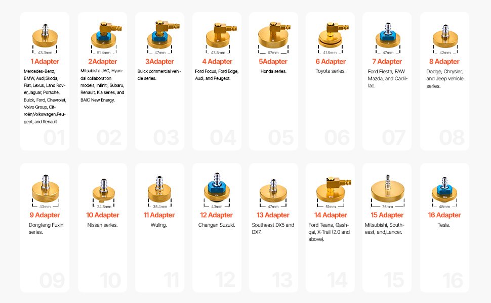 Sarjassa on 17 sovitinta, jotka sopivat moniin automerkkeihin, kuten Mercedes‑Benz, BMW, Audi, Tesla, Ford, Subaru, Buick ja useat muut.