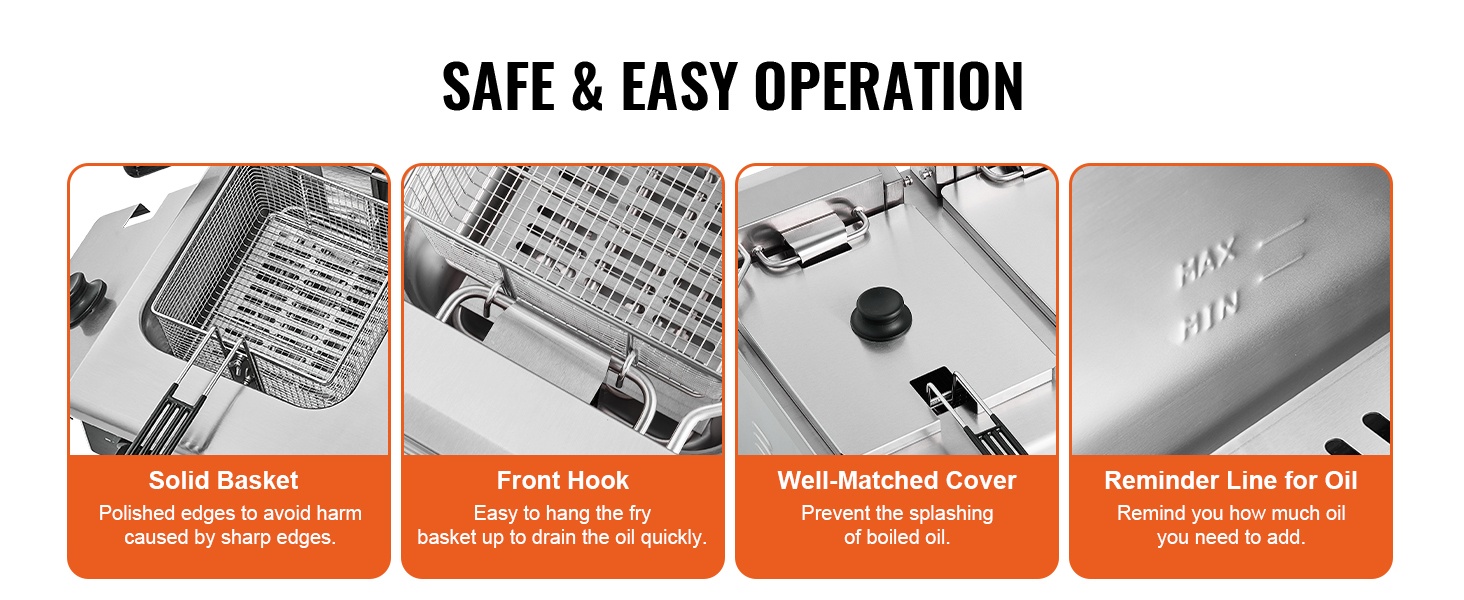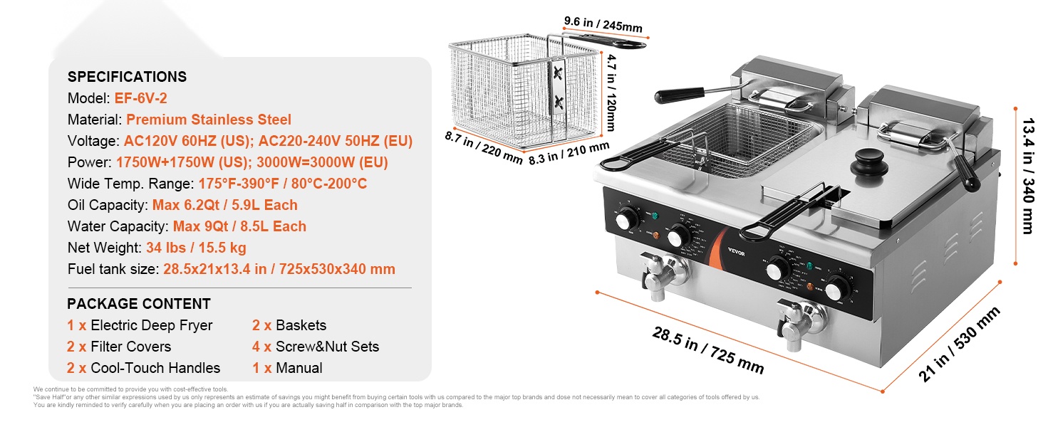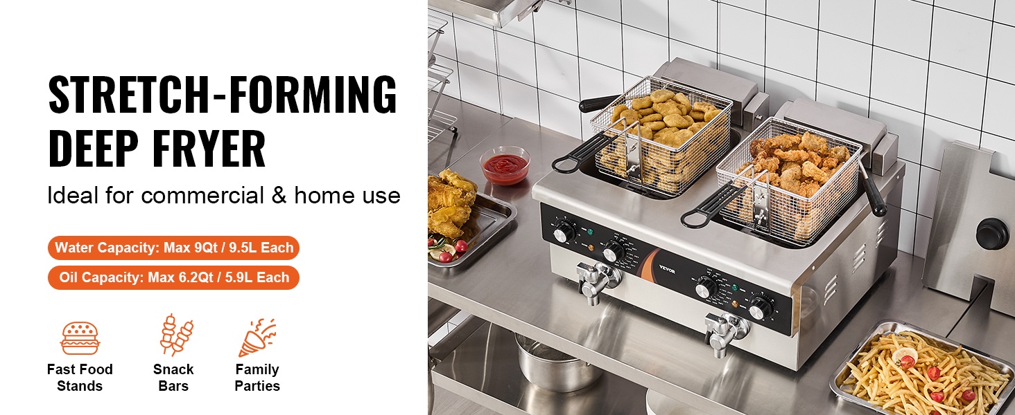 Tämä kaupallinen sähkörasvakeitin soveltuu erilaisten ruokien friteeraamiseen. Vesikapasiteetti on max 9Qt / 8.5L per säiliö ja öljykapasiteetti max 6.2Qt / 5.9L per säiliö, joten laite sopii hyvin jatkuvaan käyttöön ammattikeittiöissä.