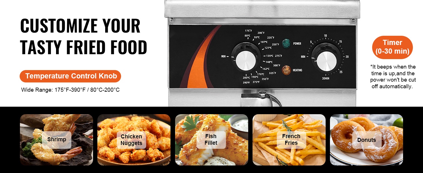 Lämpötilaa voi säätää helposti välillä 175°F–390°F (80–200°C). Rasvakeitin katkaisee automaattisesti virran, jos lämpötila ylittää 446°F (230°C) tai jos lämpötilansäätimessä ilmenee häiriö. Lisäksi laitteessa on ajastin, joka auttaa seuraamaan kypsennysaikaa.