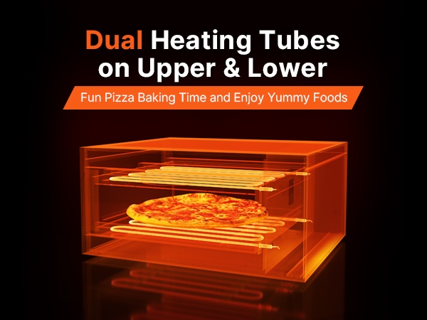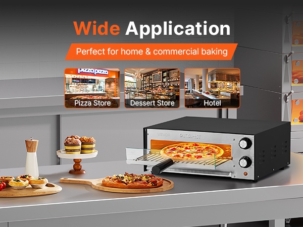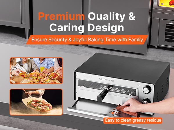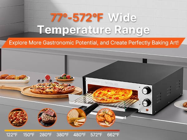 Tässä sähköisessä pöytämallisessa pizzauunissa on kestävä rakenne ja laaja lämpötila-alue 77–842°F / 25–450℃. Ylä- ja alapuolen kaksinkertaiset lämmitysputket jakavat lämmön 360° tasaisesti, mikä auttaa saavuttamaan tasaisen paistotuloksen nopeasti.