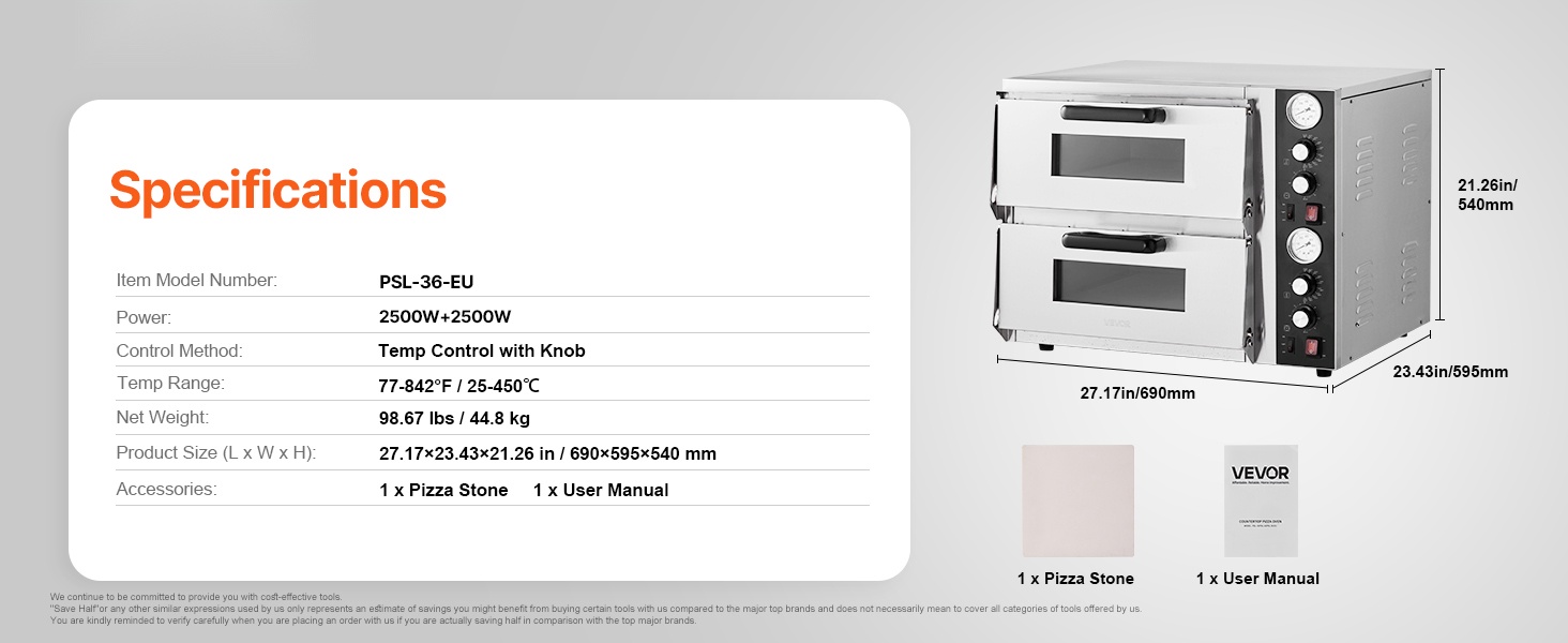 Sähköinen kaksitasoinen pöytäpizzauuni 25–450 °C 2500W+2500W omilla säädöillä