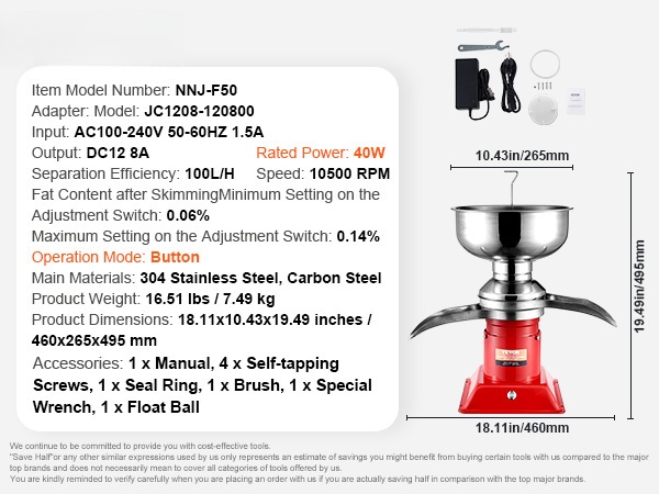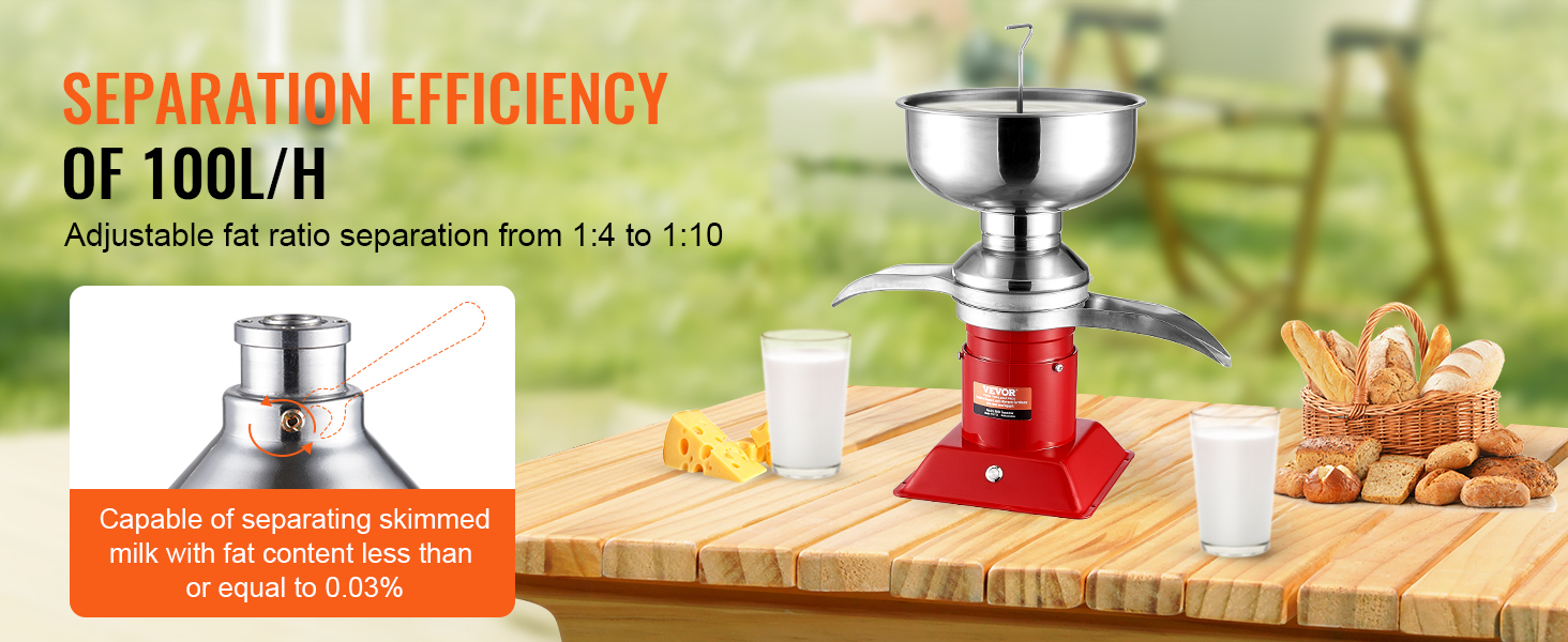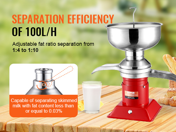 30W sähkömoottori mahdollistaa tasaisen toiminnan jopa 4 tunnin ajan. Suurikapasiteettinen maitotankki ja erotustehokkuus 100L/H (noin tunnissa) riittävät hyvin sekä kotitalouksien että pienten maatilojen tarpeisiin.