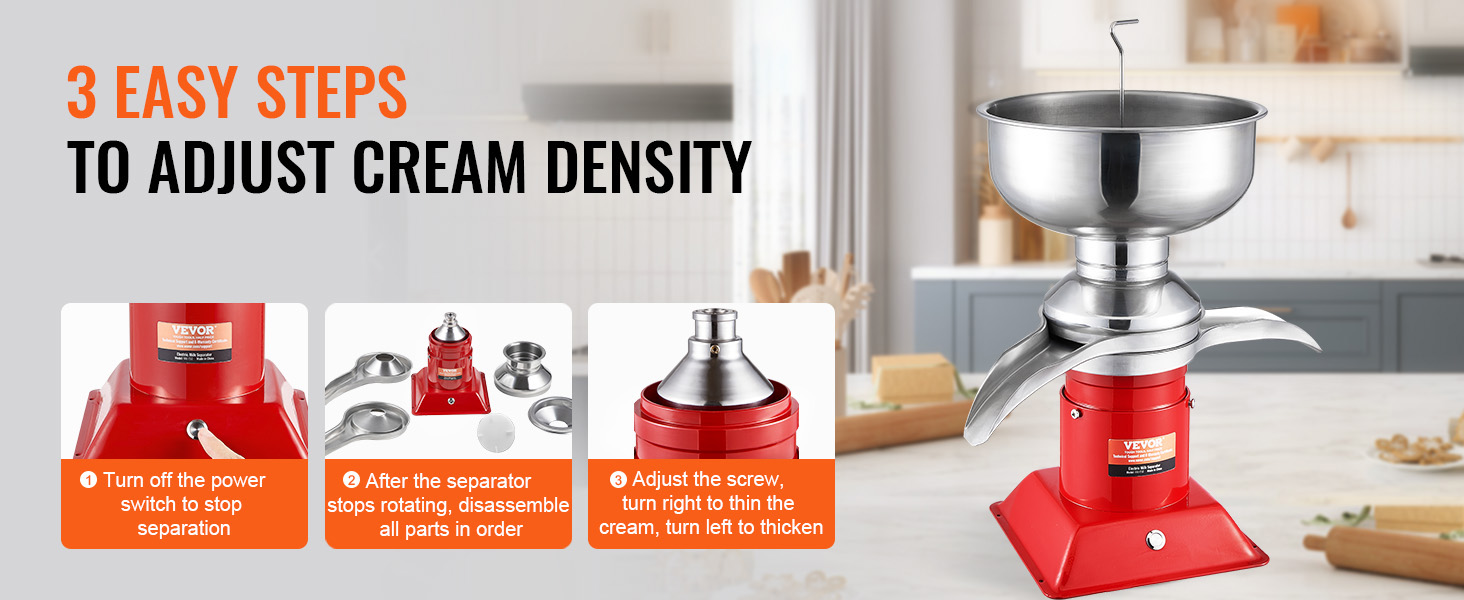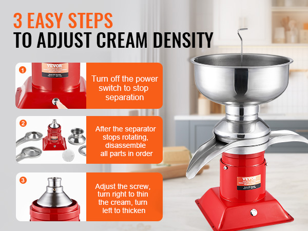 Kerman paksuutta voi säätää kiertämällä säätöruuvia. Ruuvia oikealle kiertämällä kerma ohenee ja vasemmalle kiertämällä se muuttuu paksummaksi. Näin saat helposti halutun rasvapitoisuuden erilaisiin käyttötarkoituksiin rasvasuhteella 1:4–1:10.
