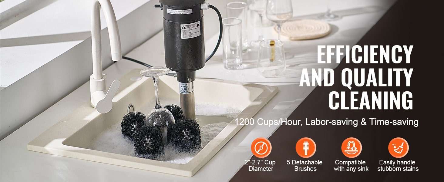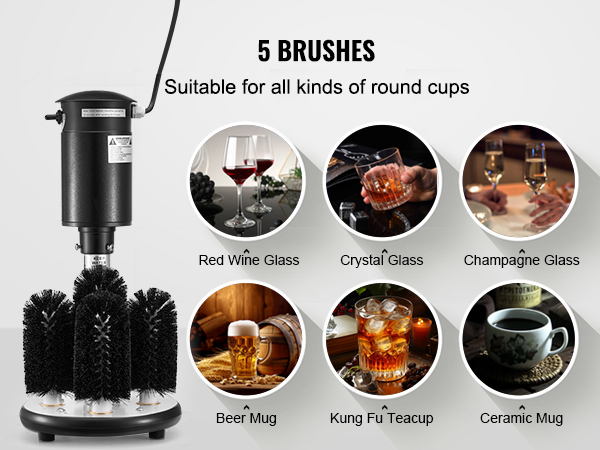 Laitteessa on 5 harjaa, jotka mukautuvat monentyyppisiin pyöreäsuisiin laseihin. Se soveltuu laajasti esimerkiksi samppanjalaseille, olutlaseille, juomalaseille ja mukeille. Ratkaisu toimii hyvin sekä koti- ja juhlakäytössä että ammattimaisessa baarissa tai kahvilassa.