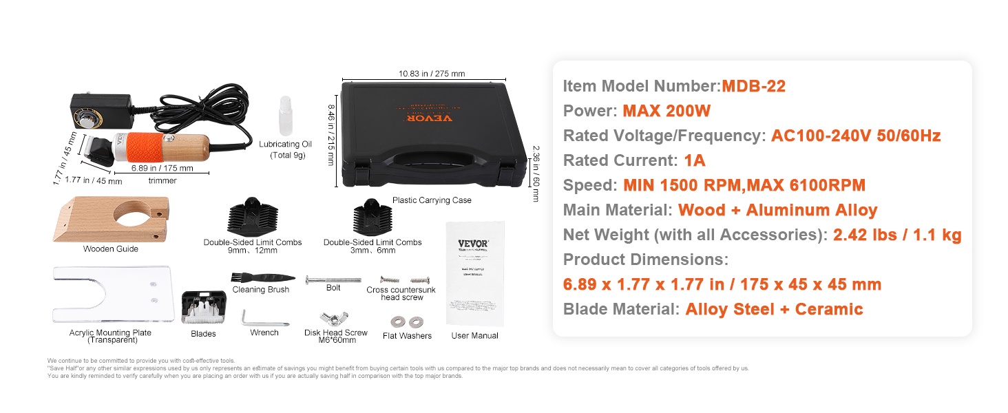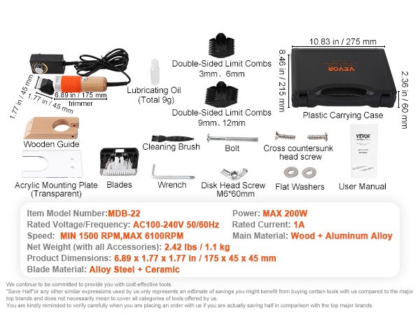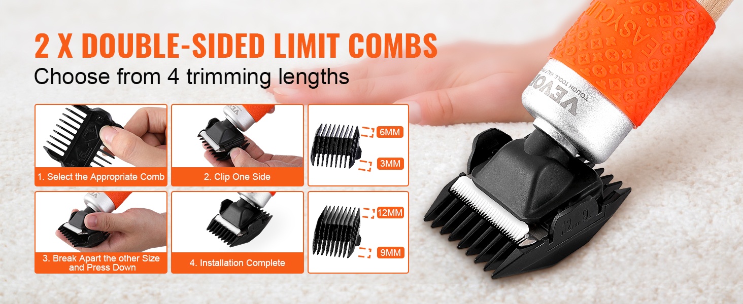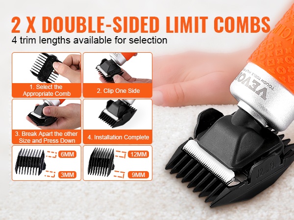 - Mukana 2 terää ja rajoitinkammat: 3mm, 6mm, 9mm, 12mm