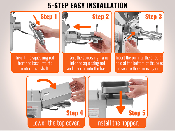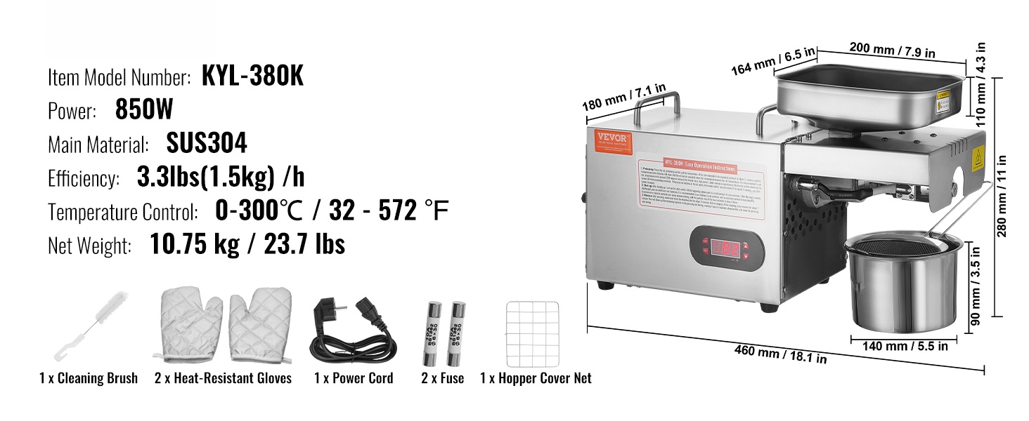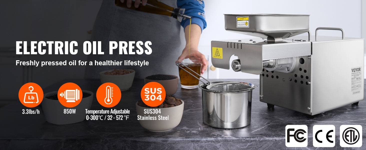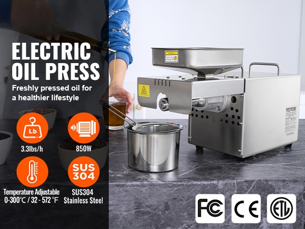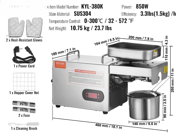 Sähköinen öljynpuristuskone auttaa puristamaan tuoretta öljyä esimerkiksi maapähkinöistä, seesaminsiemenistä, rapsista ja teensiementen kaltaisista raaka-aineista. Tehokas 850W moottori puristaa jopa 1.5kg tunnissa ja soveltuu yhtäjaksoiseen käyttöön jopa 24 tunnin ajan.