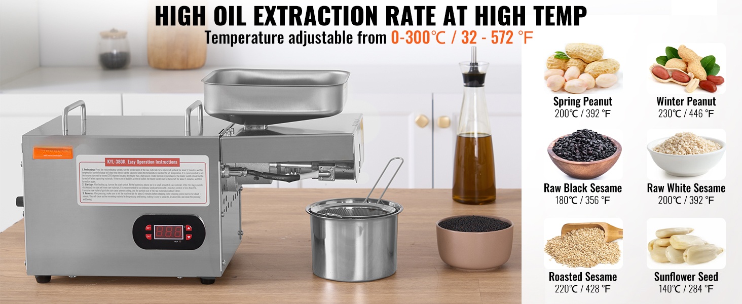 Lämpötilaa voi säätää 0–300 °C (32–572 °F); sopiva lämpötila valitaan raaka-aineen, kuten maapähkinöiden tai seesaminsiementen, mukaan parantamaan öljyn saantoa.