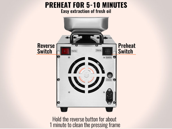 Ennen käyttöä laite esilämmitetään noin 5–10 minuuttia. Musta painike toimii käänteiskytkimenä, pysäytys- ja käynnistyspainikkeena. Painamalla käänteistoimintoa noin 1 minuutin ajan voidaan puhdistaa puristuskehikkoa ja helpottaa siementen poistumista.