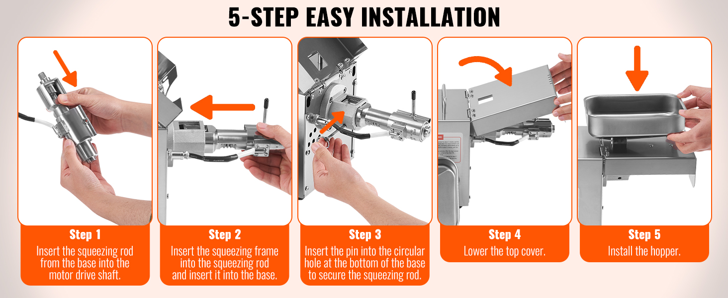 Runko ja puristusosat ovat valmistettu SUS304-ruostumattomasta teräksestä, joka on kestävä ja helppo puhdistaa. Kompakti malli, jonka nettomassa on vain 10.75 kg, on helppo siirtää keittiöön, ravintolaan, maatilalle tai puutarhaan.