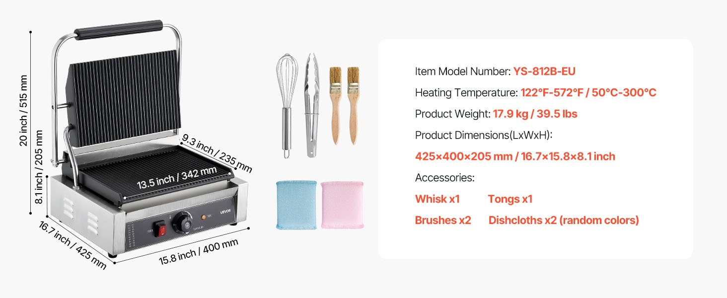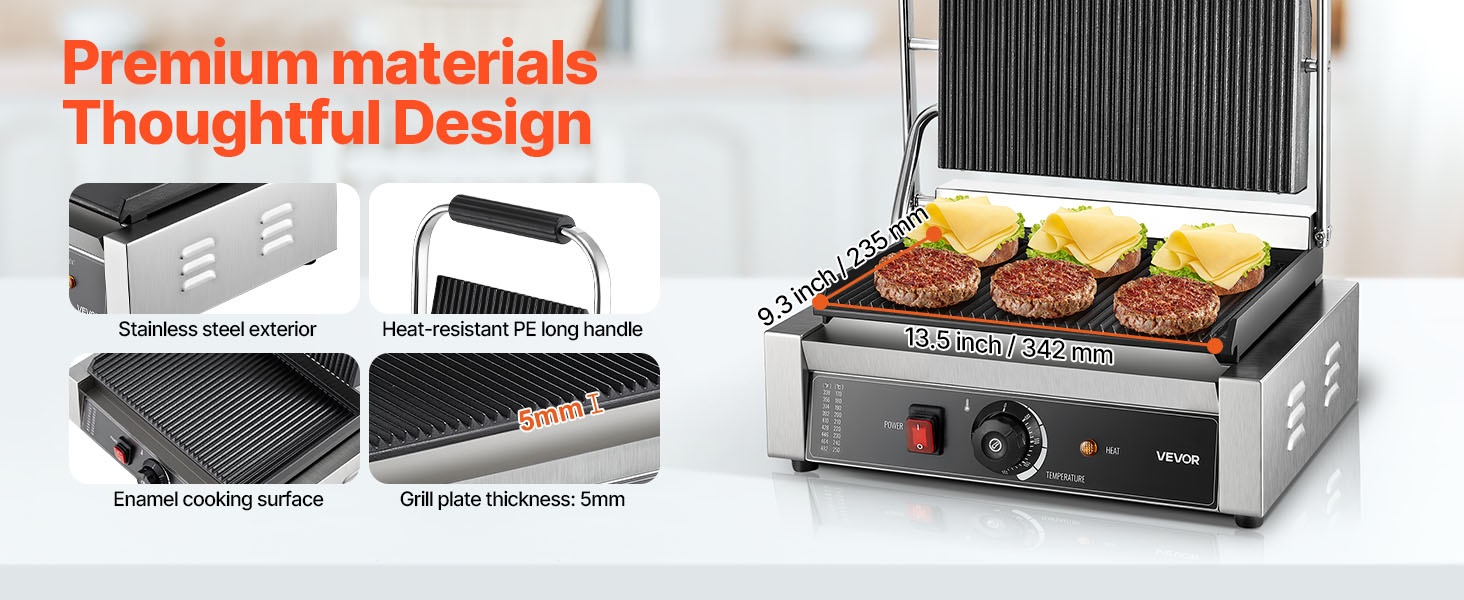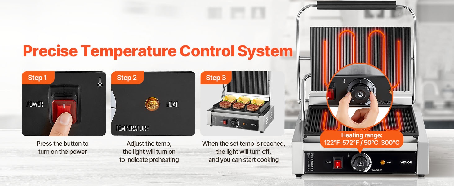 Sähköisessä paninigrillissä on tarkka lämpötilansäätöjärjestelmä. Lämpötila-alue on 122°F–572°F / 50°C–300°C, joten voit säätää lämmön eri raaka-aineille ja kypsyysasteille sopivaksi.